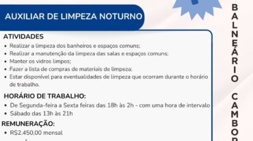 - Estar disponível para eventualidades de limpeza que ocorram durante o horário de trabalho.