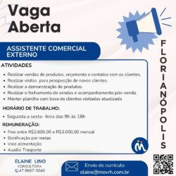 MOV Soluções em Desenvolvimento EmpresarialEfetivoDescrição Nosso cliente é um Escritório de Con..Contábil, Finanças, Economia Balneário CamboriúSanta Catarina, Brasil 17 out 2025 F - R$ 2.501,00 - 3.000,00Assistente Comercial Externo [2532406]